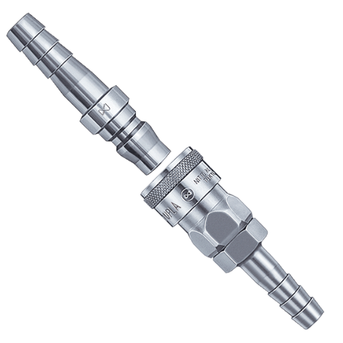 有優越通用性的快速接頭,可用于從工廠的空氣配管到空氣工具的軟管 連接的各類用途。 ●鋼鐵材質適用于空氣,黃銅、不銹鋼材質適用于水。 但是,分離時流體從插塞一側流出來,敬請注意。 鋼鐵材質的重要構成部件經過熱處理增加了強度。有良好的耐磨損性和耐久性。 ●主體材質與尺寸種類豐富,安裝形狀標準化,可用于廣泛的空壓用途。